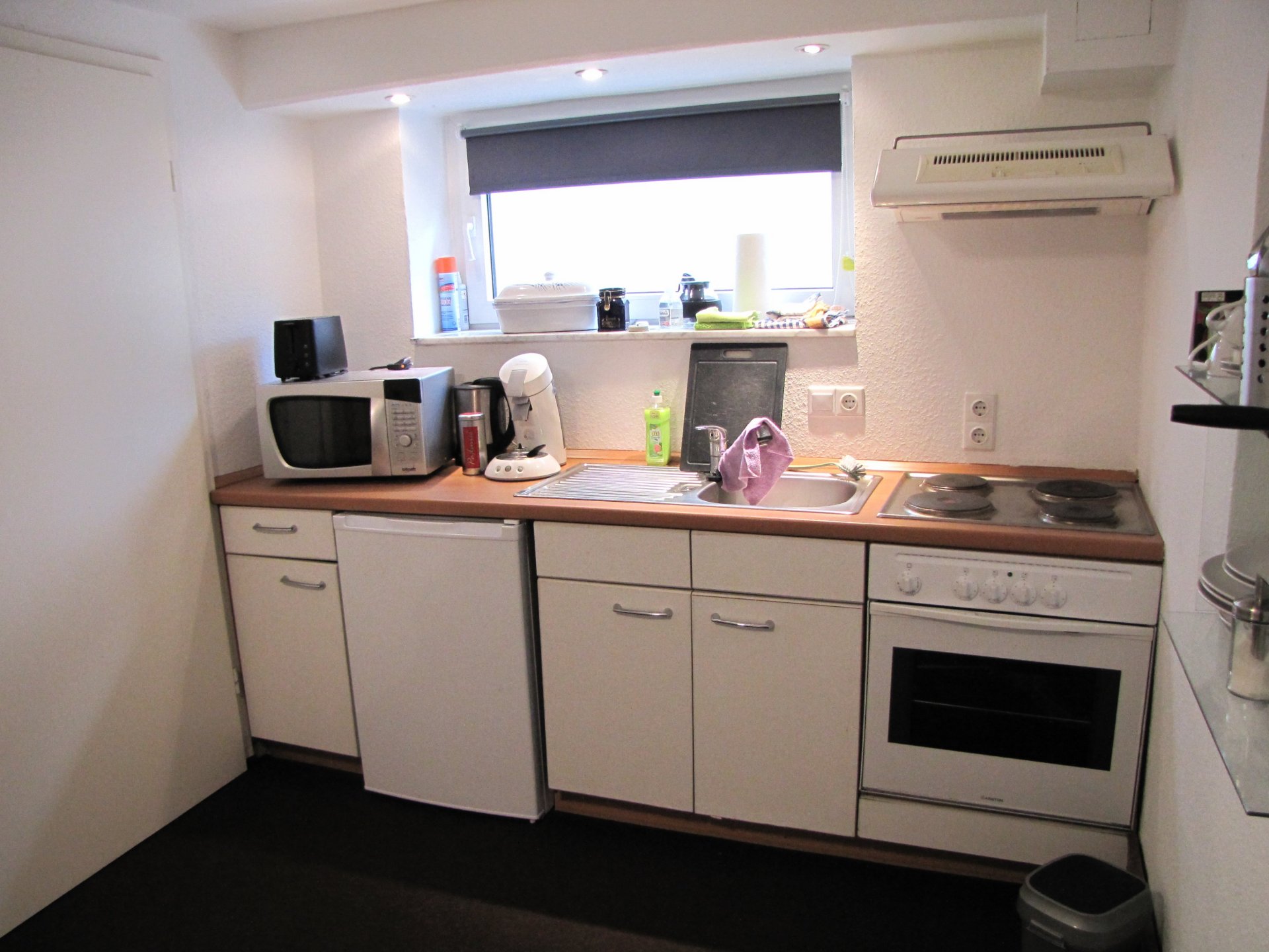 Töpfen, Pfannen und Mikrowelle und Kaffee-Maschine
